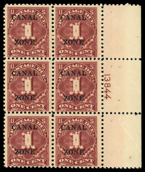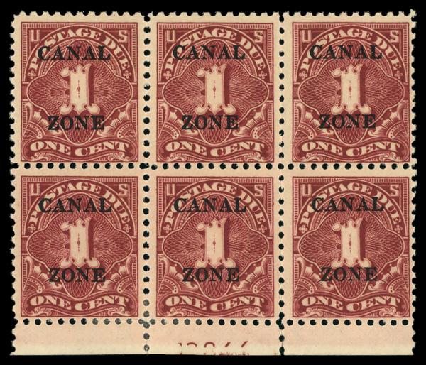 Postage Due, 1925, 1c carmine rose 'CANAL/ZONE' overprint (Scott J18), plate block of 6, disturbed o.g., Fine. Scott $90. (Image)