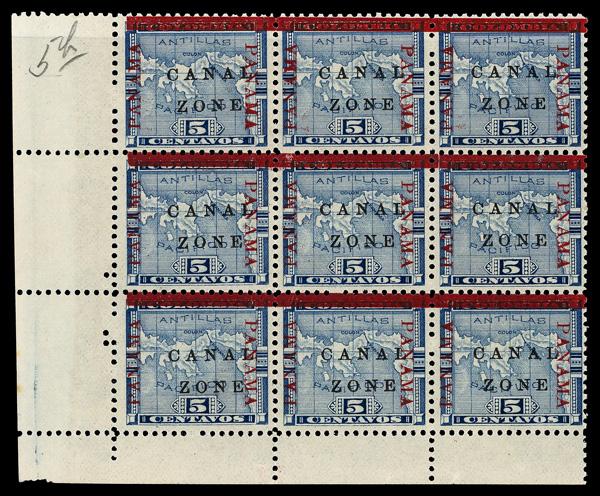 1904, Panama 5¢ blue, red bar & 'CANAL/ZONE' overprint (Scott 12), corner margin block of 9, o.g., lightly hinged (2 stamps never hinged), Fine to Very Fine. Scott $68. (Image)