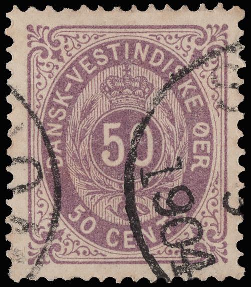 1874, 50¢ violet (Scott 13), fresh and beautifully centered with two partial 1904 St. Thomas c.d.s.s, Extremely Fine. Scott $390. (Image)