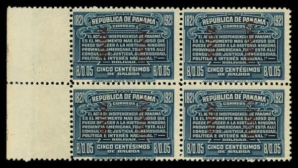 1921, 5c blue, red 'CANAL/ZONE' overprint, reading down (Scott 62a), block of 4, slightly disturbed o.g., Fine. Scott $260. (Image)