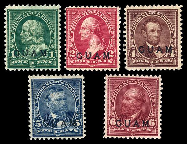1899, 1¢-2¢ & 4¢-6¢ 'GUAM' overprint (Scott 1-2, 4-6), o.g., hinged, Fine to Very Fine. Scott $320. (Image)