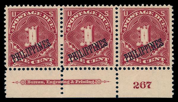 Postage Due, 1899, 1¢ deep claret (Scott J1), plate number strip of 3, o.g., lightly hinged, Very Fine to Extremely Fine. Scott $125. (Image)