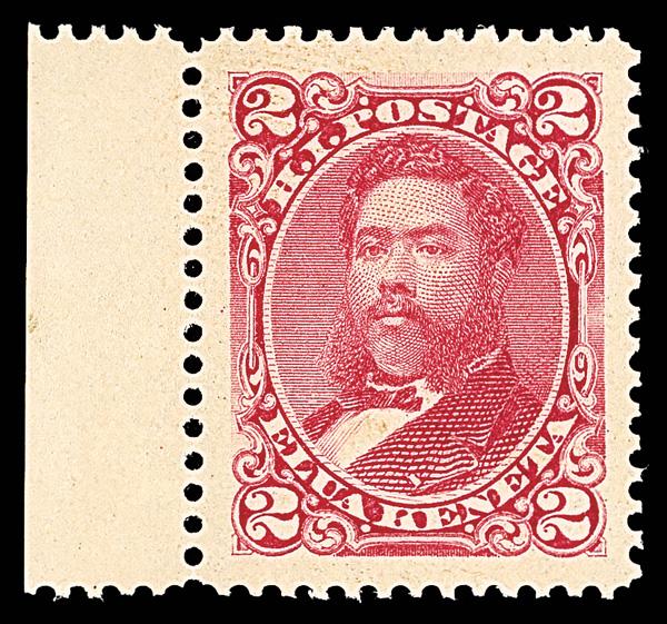 1886, King David Kalakaua, 2¢ rose (Scott 43), the SMQ does not currently price this issue, strong balanced margins, o.g., never hinged, Extremely Fine to Superb, with 2006 P.S.E. certificate graded XF-SUP 95J. Scott $11. (Image)
