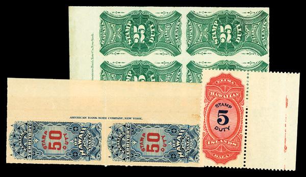 Revenue, 1901, $50 slate blue & carmine (Scott R1, R12, R15), R1 imprint block of 4, R12 imprint pair, R15 single, very rare imprint multiples, o.g., R1 never hinged / R12 disturbed o.g. / R15 previously hinged; ER12 pair has minor perf separations, Fine to Very Fine, each with a P.S.E. certificate. Scott $315. (PDF for this Lot) (Image)