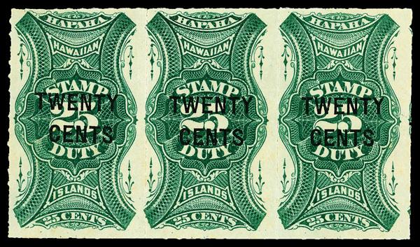 Revenue, 1893-94, 20¢ on 25¢ green (Scott R7), strip of 3, o.g., never hinged, sound and Post Office fresh, Fine to Very Fine, with 2019 P.S.E. certificate. Scott $180. (Image)