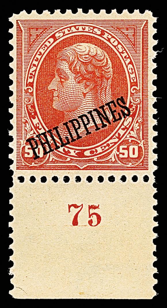 1899, 50¢ orange (Scott 219), bottom margin plate number 75 single, o.g., lightly hinged, lovely example with clean color and bold detail, nicely centered on fresh paper, Very Fine. Scott $125. (Image)