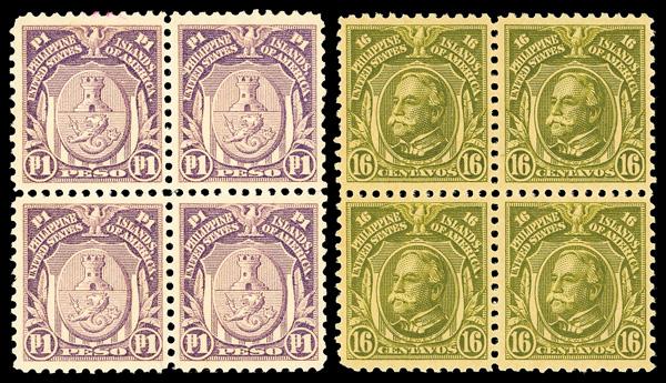 1917, 16c light olive green and 1P pale violet (Scott 296, 300), blocks of 4, 16c left stamp with short corner perf, 1P has tiny red stain spots on top left stamp, o.g., 296 with disturbed gum, 300 is never hinged, Fine to Very Fine, both with 2025 P.S.E. certificates. Scott $620. (Image)