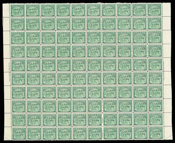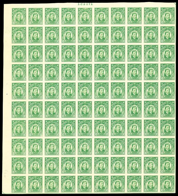 1904, 1c Map, green (Scott 9), complete sheet of 100 with imprints left and right, wonderfully fresh and bright with solid to superior centering, position 26 #9a (only 500 issued), position 48 #9b (only 1500 issued); position 1 previously hinged, position 91 hinged, others never hinged, Very Fine, with 2019 P.S.E. certificate. Scott $418 as blocks & singles. (Image)