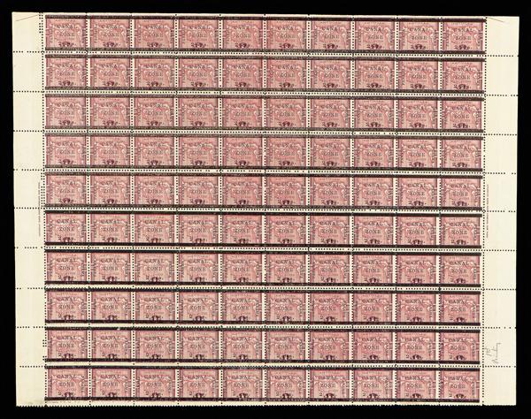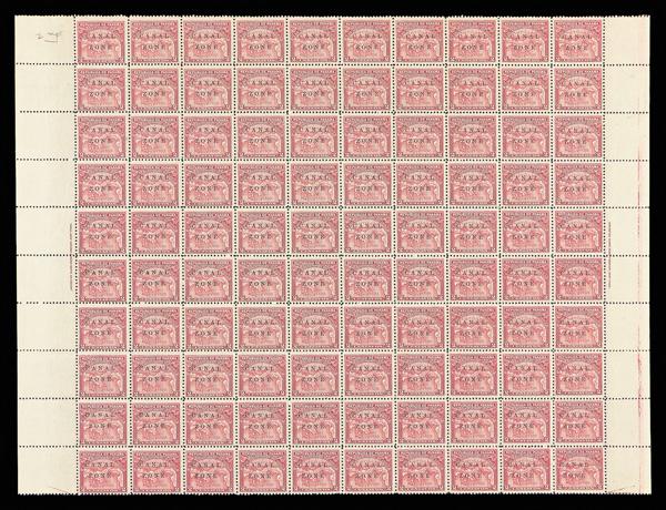 1904, 2¢ on 1p Map, lake, surcharge type "e" (Scott 17a), top full pane of 100 with two American Bank Note Company imprints, disturbed o.g., fresh with enticing color and clean detail, "second printing" penciled in selvage; tiny faults, lacking top selvage, Fine to Very Fine, with 2023 P.S.E. certificate. Scott $300 as blocks of four. (Image)