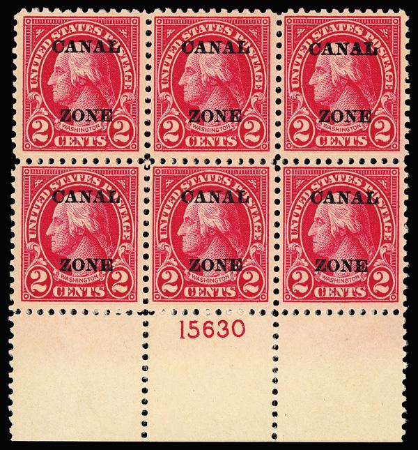 1924, 2¢ Washington, flat "A" (Scott 73), bottom margin plate number 15630 block of 6, tropicalized o.g., very lightly hinged at center, a lovely example with immense color depth and bold overprints, nearly Very Fine. Scott $160. (Image)
