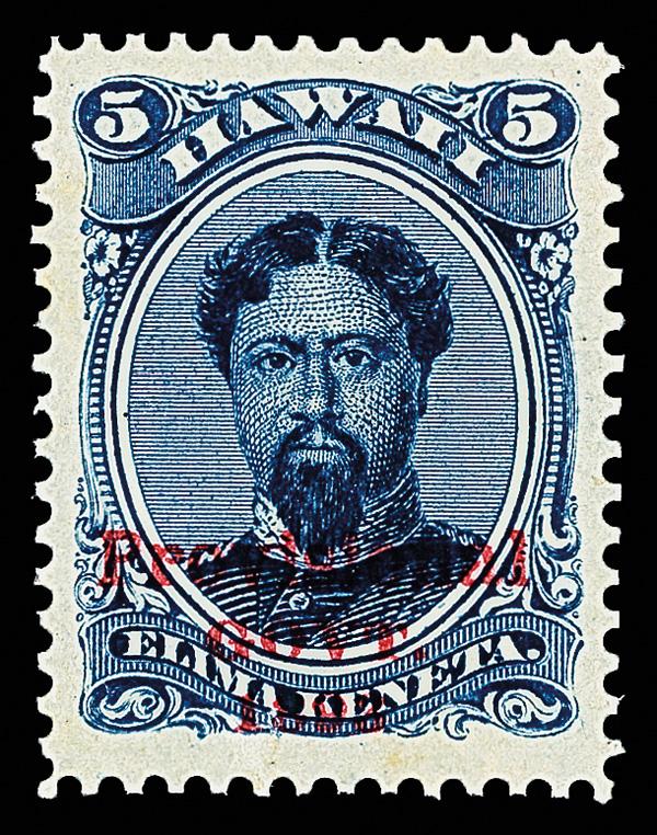 1893, Provisional Govt., 5¢ deep indigo, red overprint (Scott 58), o.g., never hinged, Post Office fresh with immense color depth on bright paper, sound with superior centering, Extremely Fine to Superb. Scott $32. (Image)