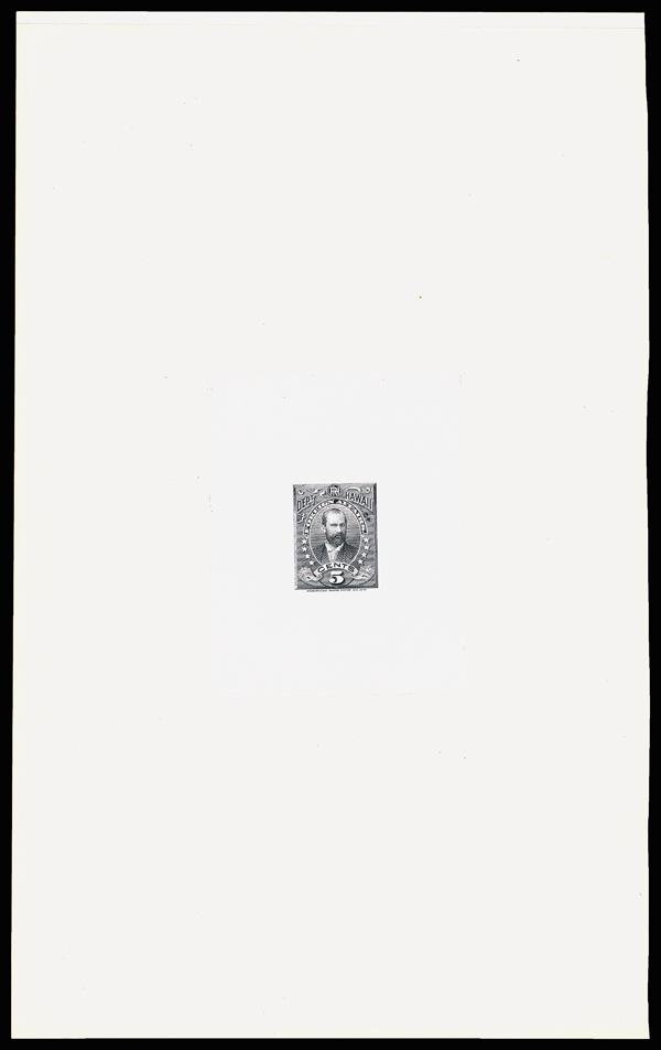 Officials, 1896, 5¢, 12¢ and 25¢, large die proofs (Scott O2, O5, O6), lovely trio, reprinted from the original dies, on 65 x 83mm wove (bright white), on die-sunk cards measuring 166 x 266mm, exceptionally bright and fresh; 25¢ with top left corner crease to card; any lines in images due to holders, Very Fine. (Image)