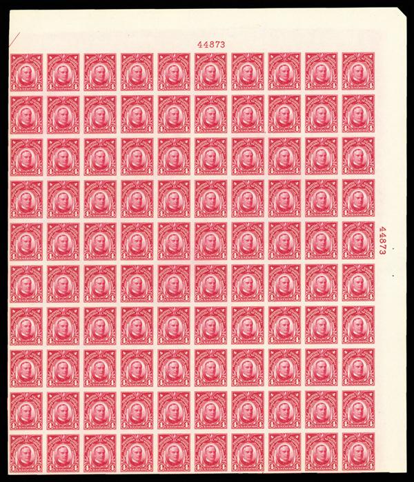 1904, 2c Map, rose (Scott 10), top full pane of 100 with two American Bank Note Company imprints, disturbed o.g., with crisp color and detail on fresh paper; positions 1 & 2 tiny thins, positions 71-75 with horizontal crease at top; a couple vertical perforations separated in lower left selvage tab, Fine to Very Fine, with 2023 P.S.E. certificate. Scott $475 as blocks of four. (Image)