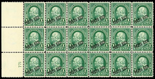 1899, 1¢ yellow green (Scott 210), left margin horizontal block of 18 with plate number 771, o.g., never hinged, sound with immense color depth and clear detail, each overprint crisp and deep, Very Fine, with 2021 P.S.E. certificate. Scott $234 as singles. (Image)