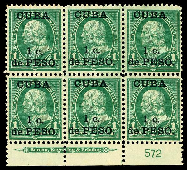 1899, 1c on 1¢ Franklin (Scott 221), bottom margin plate block of 6 with plate number 572, Fresh with excellent color, slightly disturbed o.g., Very Fine. Scott $290. (Image)