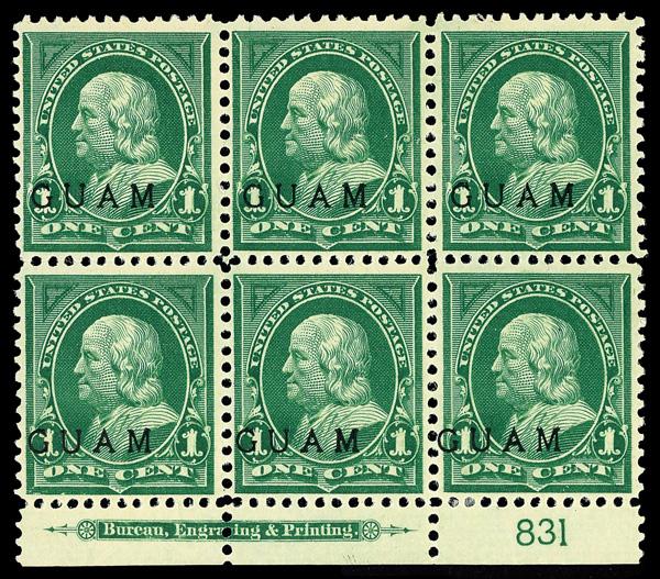 1899, 1¢ Franklin, deep green (Scott 1), bottom margin plate block of 6 with plate number 831, Clean with notable freshness, disturbed o.g., Fine to Very Fine. Scott $350. (Image)