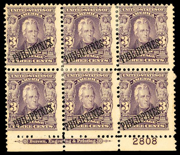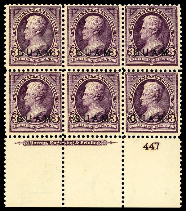 1899, 3¢ Jackson, purple (Scott 3), wide bottom margin plate block of 6 with plate number 447, Fresh and carefully preserved, disturbed o.g., Fine. Scott $1,600. (Image)