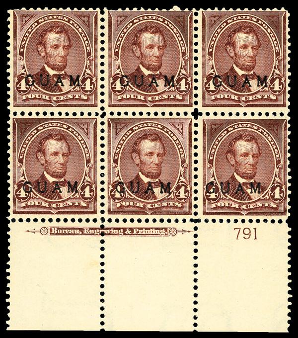 1899, 4¢ Lincoln, lilac brown (Scott 4), wide bottom margin plate block of 6 with plate number 791, Fresh and attractively clean, slightly disturbed o.g., Fine. Scott $1,750. (Image)