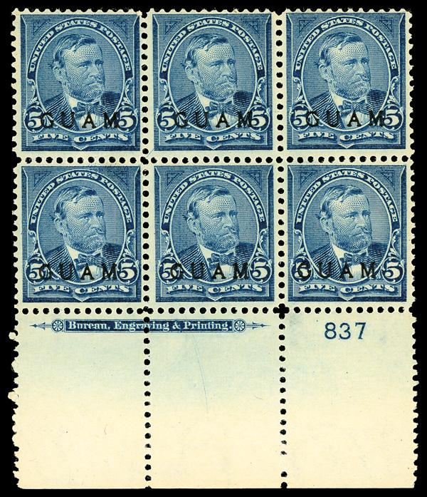 1899, 5¢ Grant, blue (Scott 5), wide bottom margin plate block of 6 with plate number 837, Fresh, undiminished appearance, disturbed o.g., Fine. Scott $700. (Image)