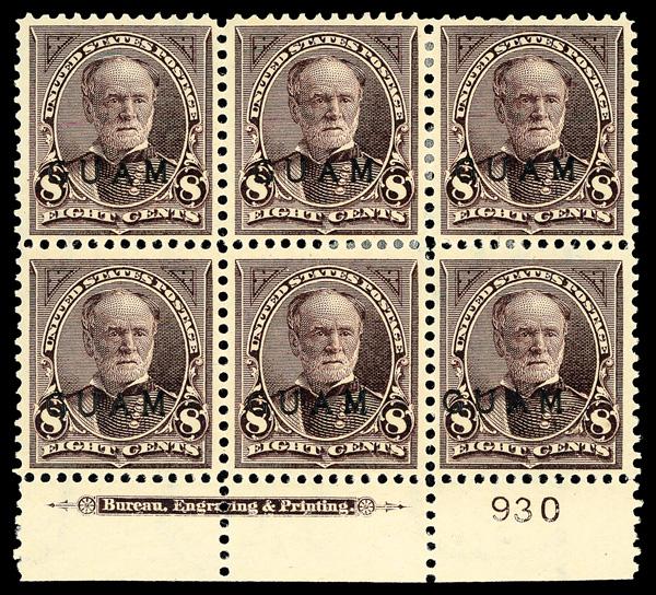 1899, 8¢ Sherman, violet brown (Scott 7), bottom margin plate block of 6 with plate number 930, Bright, fresh overall condition, disturbed o.g., Fine to Very Fine. Scott $1,250. (Image)