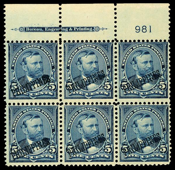 1899, 5¢ blue (Scott 216), top margin plate block of 6 with plate number 981, Fresh and appealingly clean appearance, disturbed o.g., Fine. Scott $850. (Image)
