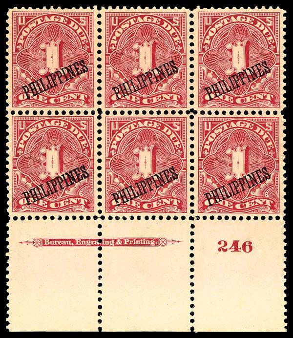 Postage Due, 1899, 1¢ deep claret (Scott J1), bottom margin plate block of 6 with plate number 246, Fresh with solid presence, slightly disturbed o.g., Very Fine. Scott $650. (Image)