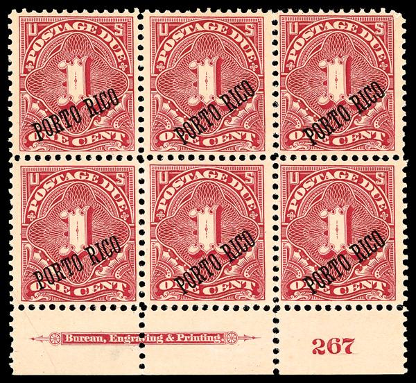 Postage Due, 1899, 1¢ deep claret (Scott J1), bottom margin plate block of 6 with plate number 267, Bright and well-kept, o.g., previously hinged, Fine to Very Fine. Scott $625. (Image)