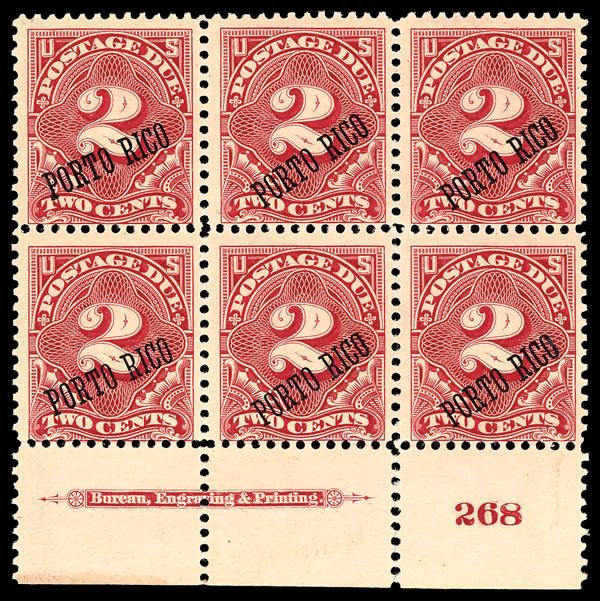 Postage Due, 1899, 2¢ deep claret (Scott J2), bottom margin plate block of 6 with plate number 268, Fresh with pleasing vibrancy, o.g., previously hinged; perforation separation at bottom, Fine. Scott $800. (Image)