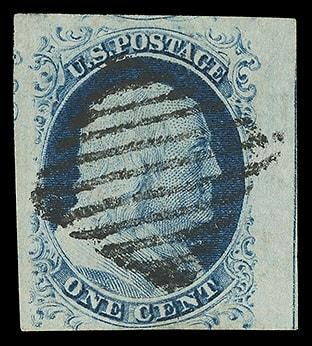 1851, 1¢ blue, type II, plate 3. Position 28L3, ample margins to barely in across bottom, attractive and light cds, rich color and sharp impression; light age spot lower right, F.-V.F. appearance. Scott No. 7; $360. US$0 (Image)