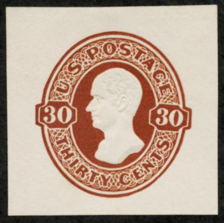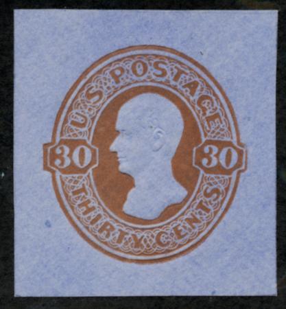 US - Postal Stationery. Scott U339, 35x37, 1887-94 30c red brown, blue CV $40.00 (Image)