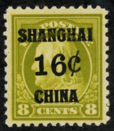 US - Offices in Shanghai. Scott K8,VF VLH, 1919 16c on 8c olive bister CV $65.00 (Image)