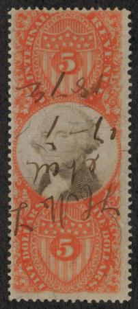 US - Revenues/Documentaries (R). Scott R148, F-VF, intact perfs! $5 vermilion & black, 1872 CV $50 NH (Image)