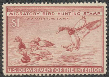 US - Migratory Bird Hunting (RW). Scott RW13, F-VF HR, 1946 $1, red brown CV $50 NH (Image)