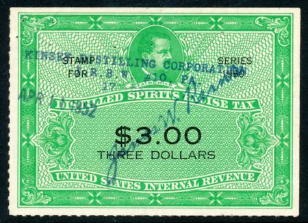 US - Distilled Spirtits ExciseTax (RX). Scott RX8, VF, Distilled Spirits, 1950 $3 yellow green & black CV $20 NH (Image)
