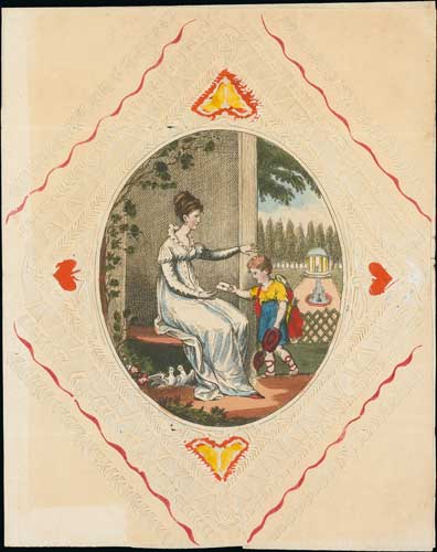 1805 Valentine lettersheet depicting cupid delivering a letter to a seated lady, doves below, within a central oval, well handpainted, with elaborate handcut borders incorporating hearts, a handwritten verse inside, posted from Kingston on Thames to "Mrs Knowles, Leominster Hill, Arundel, Sussex" with "KINGSTON-T / 12" mileage mark. A few minor splits to the borders at the folds, otherwise fine, a superb early postally used valentine. Photo on Page 66. (Image1)