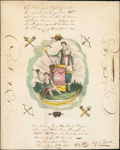 1808 Valentine lettersheet depicting a cupid and lady holding the "Rights of Love", an arrow through crossed hearts, entitled "May our hearts be thus transfixed", handpainted with handwritten verses, posted within the London 2d Post to "Miss A. Hayes, No 10 Mays Buildings, Bedford Bury" with FE 15 datestamp and "Two Py-Post / Unpaid / Gerrard St". The side flap with a note written in 1933 by the Great Granddaughter of the recipient. An attractive early postally used valentine. Photo on Page 66. (Image1)