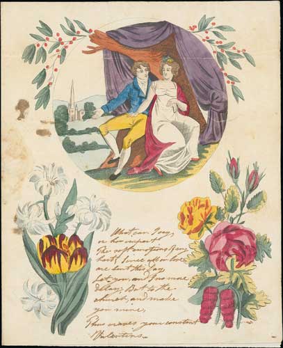 1817 Valentine lettersheet depicting flowers and an arrow through crossed hearts, a central rose lifts to reveal two seated lovers with a church behind, handpainted with a printed verse above, a long handwritten verse within. Posted within the London 2d Post addressed to "Miss F. Gwynne, at Mr Towers, St. Clements Lane, Near Yeates's Court" with "Blackheath / 2py P. Paid" and red FE 14 datestamps, fine and attractive.