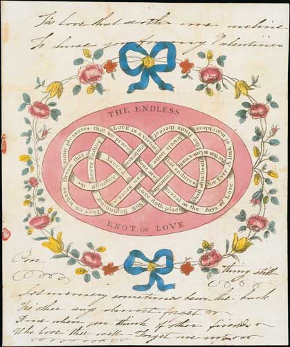 c1826 Valentine lettersheet (undated but watermarked "1826") with a fine "Endless Knot of Love" within an oval surrounded by a garland of flowers and ribbons, handpainted with handwritten verses, posted to "Miss Liles, Soham Green, Cambridgeshire" with "KIMBOLTON / 66" mileage mark. A fine and scarce postally used valentine. Photo on Page 66. (Image1)