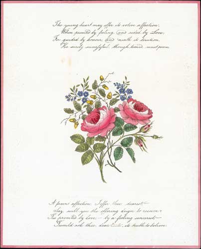 1844 Valentine lettersheet with applied and handpainted roses within an embossed frame, the embossed outer border in grey, posted within Newcastle to "Miss Anne Freeman, No. 111 Blenheim Str.", bearing a 1d red (four margins) tied by Maltese Cross, FE 8 backstamp, fine and attractive.