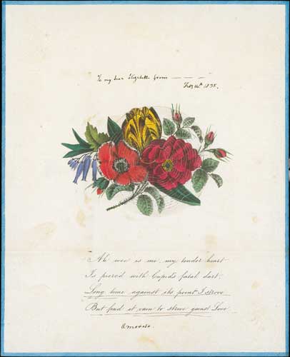 1834 Valentine lettersheet depicting cupid firing an arrow, within a bunch of flowers entitled "Love", handpainted with a verse below, posted within the London 2d Post to "Miss Robins, No. 12 Evered St., Back Church Lane, Whitechapel", handstamped "2" and "T.P / Mount St. C.S", red FE 19 backstamps. Central fold, otherwise fine and attractive.