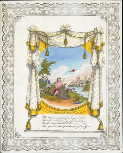 1847 Valentine lettersheet depicting a gentleman holding a letter, handpainted, within a fancy printed border, a verse below, posted within London prepaid 1d in cash to "Mr R. Willes, 11 Curcus Road, New Road, Paddington", red JA 22 datestamp and "Kingston G. Pits / 1D PAID". Small repaired tear to the address panel, otherwise fine and attractive, posted 23 days prior to Valentines Day.