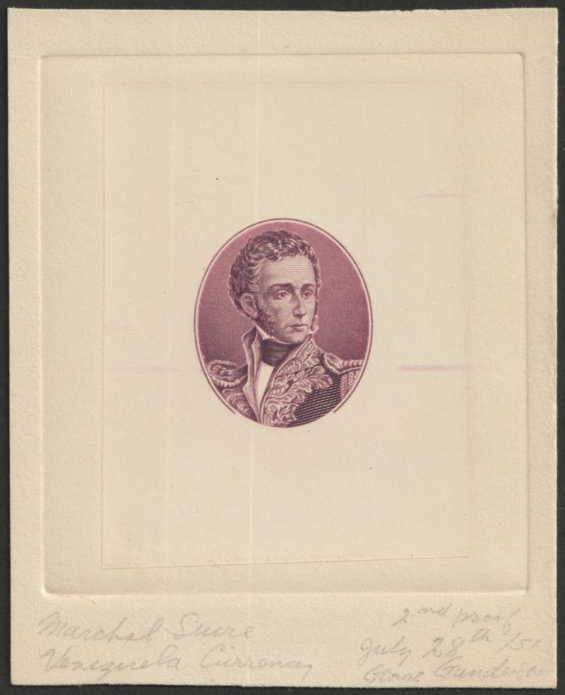 Printers proof (112mm x 126mm) Marshal Antonio Jose de Sucre vignette within oval in purple, manuscript 'Marshal Sucre/ Venezuela Currency/ 2nd Proof/July 28th/51/Grant Gundersen' in pencil. Unadopted, very similar to American Banknote Company 10 bolivares issue of 1945-60 showing a younger portrait. (Image1)