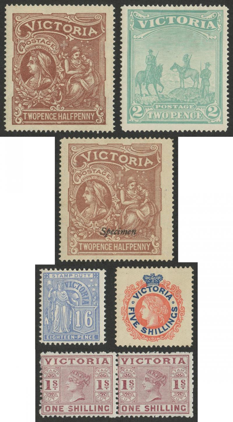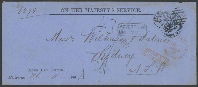 Consignment remainders comprising 1) 1854 double-rate entire to London "via Marseilles" with fine oval 'PAID/[crown]/MELBOURNE' datestamp in red & rated "4/1" on arrival; 2) 1854 stampless from GB "Per John Perry" via Singapore then P&O 'Madras' (record voyage of 61 days); 3) similar per General Screw 'Lady Jocelyn' with 'T.P/East Sheen' backstamp in blue, this & previous both pre-paid "1/-" in red & with light 'SHIP LETTER/FREE/GPO VICTORIA' arrival b/s in red; 4) 1859 to Norfolk "per Emeu" via Mauritius with crowned-oval 'CARISBROOK' backstamp, the ship had mechanical problems mid-ocean; 5) 1866 mourning cover from GB with 1d x6, scarce 22mm 'GEELONG' (unusually in red) & 'WICKLIFFE' transits & poor Warrnambool arrival, unusually overland from Geelong; and 6) 1883 OHMS cover with 'PUBLIC LIBRARY, MUSEUM/AND/NATIONAL GALLERY OF VICTORIA' imprint at lower-left, Chief Secretary Frank in rosine but no postage paid as required for overseas mailing.
