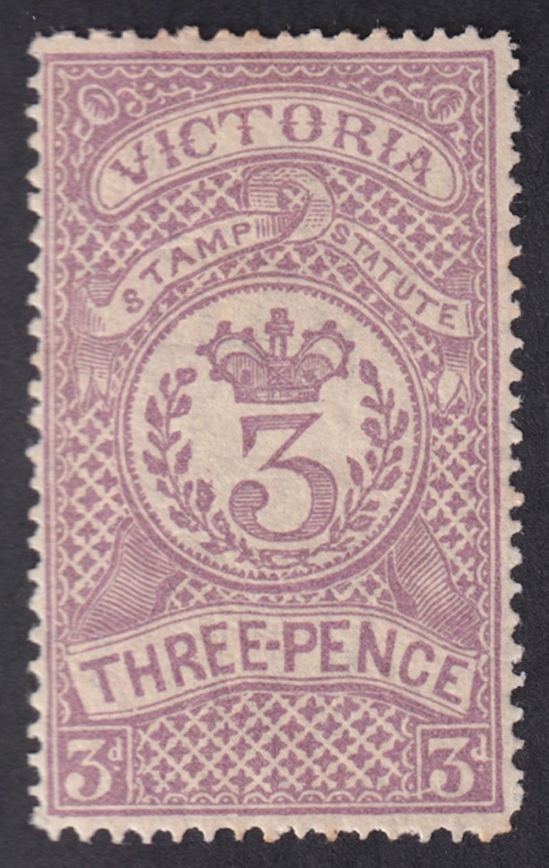 1884 Stamp Statute Typographed Wmk 19 (V1) 3d mauve SG 221, very well-centred, large-part gum, Cat £2250. Rare: Geoff Kellow at page 216 states that only 4552 were issued, making it much scarcer than the 4d - Cat £1500 - of which 23,600 were issued. Most examples on the market are 1891 official electrotype reprints without the usual 'Reprint' overprint. Ex Hugh Freeman - sold at our auction of 23.9.2011 for $2560 (Sale 168 Lot 713) - and 'Dubois' (Part IV), sold for SFr1220. RPSV Certificate (2011). (Image1)