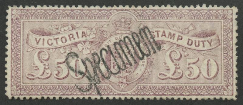 1884-1900 Ultra High Values Recess Wmk '33' £50 dull lilac-mauve SG 284 with large script 'Specimen' Handstamp Type 13 applied diagonally reading upwards, exceptional centring, some surface disturbance & no gum. Rare. Chris Cermuga Certificate (2011) states "...currently only three examples of this type". This is the stamp illustrated by Kellow Turner & McCredie at page 39. In spite of these authorities, our assessment is that the stamp is the lithographed £50 SG 287. Ex Bill McCredie: sold in 2011 for $1220. (Image1)