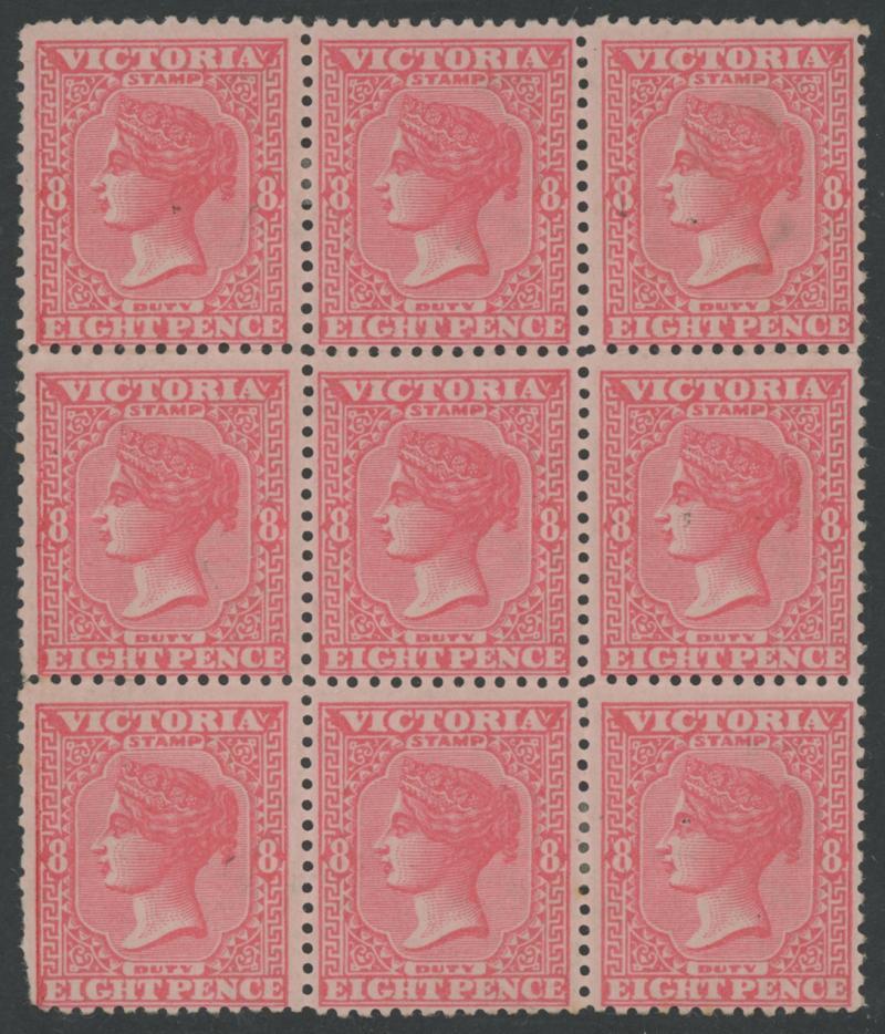 1885-95 Naish 8d rosine/pink SG 302 block of 9, the lower-left unit with damage in the left-hand margin only, the upper-right unit with ink notation on the reverse, three units are unmounted, Cat £342+ for mounted singles. The equal-largest recorded unused multiple. (Image1)