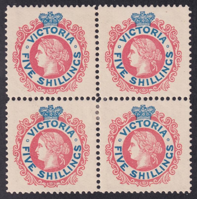1901 No 'POSTAGE' 5/- pale red & deep blue ACSC V8 (SG 283) block of 4, very well-centred, lightly mounted, Cat $360+ (£380+) for singles. A scarce multiple. Ex 'Dubois' (Part IV) where offered as the more common 'POSTAGE' 5/- SG 398, Cat £260+: sold for SFr220. (Image1)