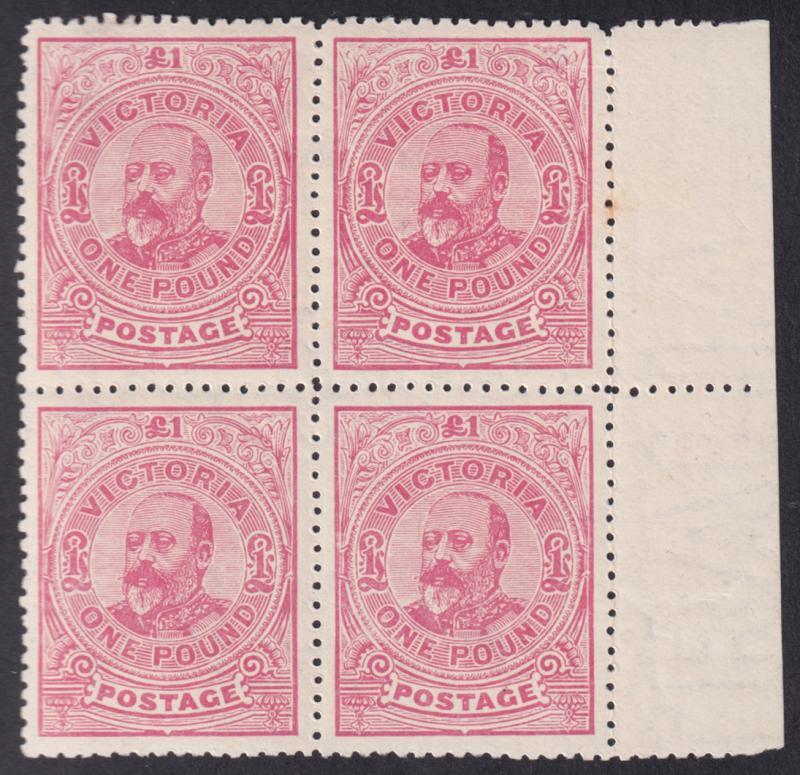 1905-13 'POSTAGE' Crown/A Perf 12½ £1 deep rose ACSC V132C (SG 431a) marginal block of 4 from the right of the sheet, excellent centring & very fresh, lightly mounted, Cat $2000+ (£1600+) for singles. A rare & under-appreciated multiple: if this was a Kangaroos £1 Bicolour block of 4 of similar centring & quality, our estimate would be $25,000+. Ex 'Dubois' (Part IV): sold for SFr1035.. (Image1)