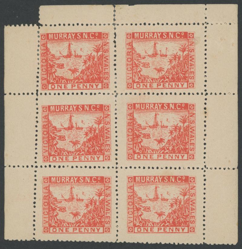 LOCAL STAMPS: Murray River Steam Navigation Co 1d red block of 6 (2x3) with margins except at the base, some minor toning/aging, some minor perf separation/reinforcing, large-part gum. Ex 'Brussels Find'. (Image1)