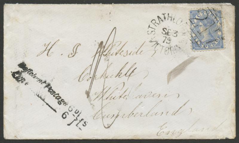 Taxed covers including 1872 to USA with 6d only & boxed 'DETAINED FOR ("2D")/ADDITIONAL POSTAGE' but with the 2d stamp lost & replaced by some dill with a 9d, 1886 unstamped local cover with superb '2D/MORE TO PAY'-in-oval & Astley 1d pair added, 1890 to Queensland with 1d only & very fine 'DEFICIENT POSTAGE 1/FINE 2 - 3D', 1891 'RETURNED MORE TO PAY LETTER' envelope with Postage Due 2d affixed, etc, also 1868 to Wales with 'VIA/MARSEILLES' "ribbon" & Laureates 10d, 1875 from GB with 6d & 1/- paying double-9d rate, and 1852 stampless entire from London with transcript of the lengthy social letter, condition variable but most are fine to very fine; also 1861 'MAIL CONTRACTS' & 'postal contracts' Blue Papers, and an album of Colonies/States stamps with some postmark interest.
